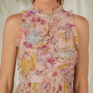 This tiered. printed mesh maxi dress is simply stunning. with ruffled mesh detail at the bodice. Sleeveless with back zip and fully lined. it has a beautiful drape and swing. Polyester. Dry clean. Imported. Sizes XS (0–2). S (4–6). M (8–10). L (12–14). XL (16–18). Approx. 57.5l.