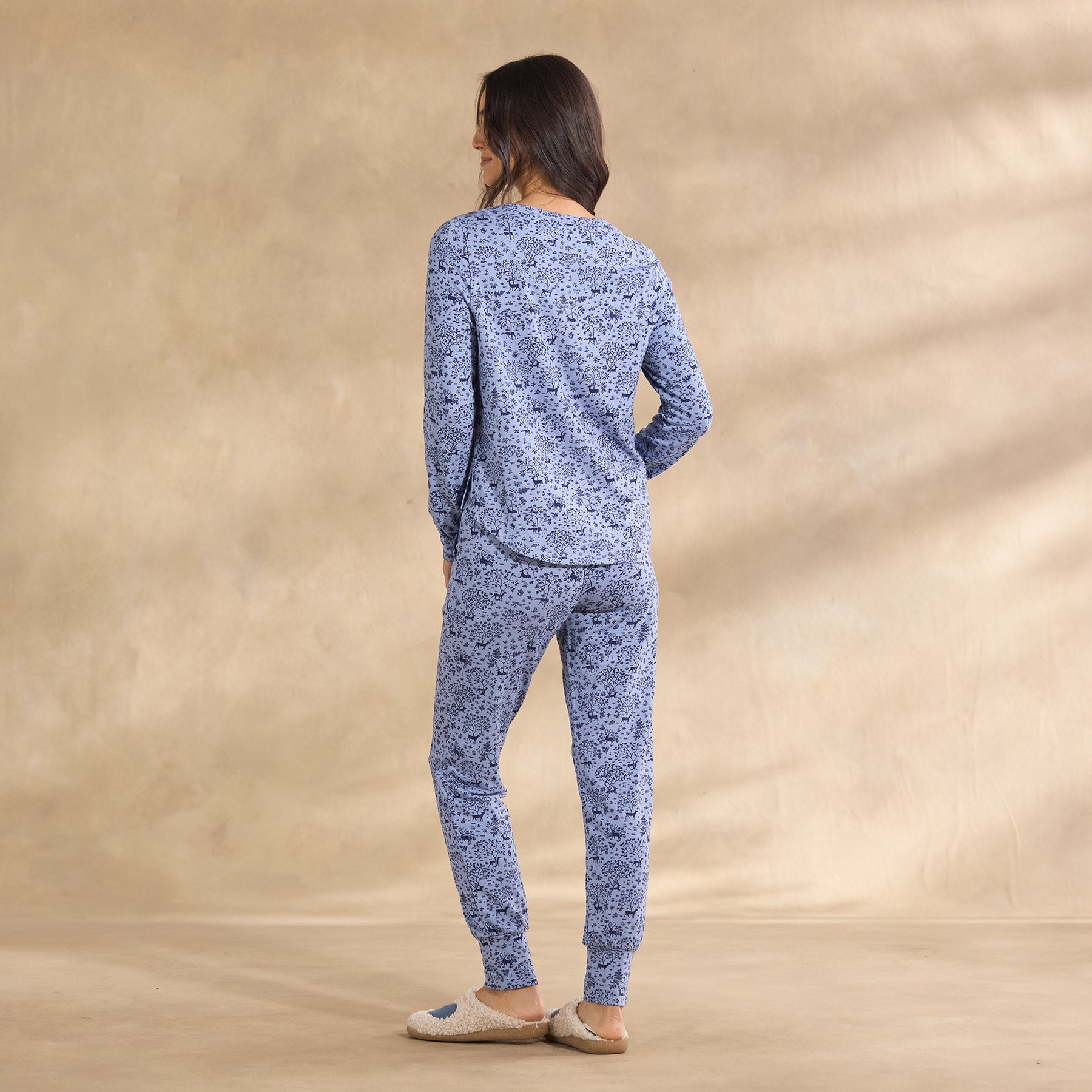The softest. printed French terry pajama set of the highest quality. with scoop neck. shirttail hem. side notches and velvet trim at back neck. Bottoms have elastic waist. two pockets and twill drawstring. Ready for gifting. the set comes in a printed bag with velvet ties. Rayon/spandex. Machine wash. Imported. Exclusive. Sizes XS (0–2). S (4–6). M (8–10). L (12–14). XL (16–18). XXL (20–22). Top approx. 24.5l. Bottoms 29 inseam.