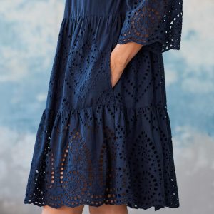 Captivating eyelet details and an appliqué. notched neckline take this charming. tiered dress to transcendent heights. Cotton. Hand wash. Imported. Sizes XS (0 to 2). S (4 to 6). M (8 to 10). L (12 to 14). XL (16 to 18). XXL (20 to 22). Approx. 38-1/4L.