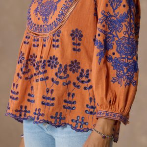 Stunning allover embroidery adds wonder and beauty to our vibrant notch neckline top graced with ladder lace insets. eyelet details and ruffles at the neckline. Bracelet length sleeves. Camisole sold separately. Cotton. Machine wash. Imported. Exclusive. Sizes XXS (00). XS (0–2). S (4–6). M (8–10). L (12–14). XL (16–18). Approx. 24l.