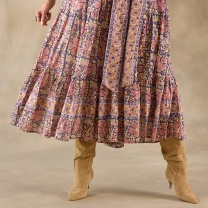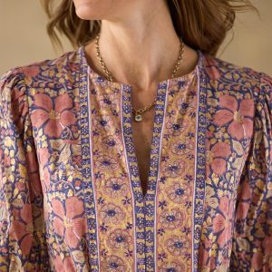 This handcrafted maxi dress features a metallic floral print with contrasting border print. elbow-length puff sleeves. a pull-over style and a self-tie belt. Cotton. Machine wash. Imported. Sizes XS (0??). S (4??). M (8??0). L (12??4). XL (16??8). XXL (20??2). Approx. 54l