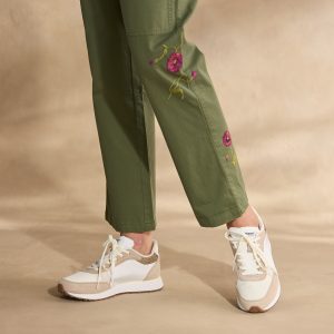 Overflowing with beautiful detail. our asymmetrical floral embroidered cargo pants feature a flattering Hollywood waist with two buttons. five pockets and a straight leg fit. Cotton/lycra. Machine wash. Imported. Exclusive. Sizes 0?C14. 25 inseam.