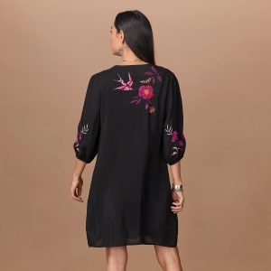This beautiful. rayon georgette shift dress is a head-turner. with deep. saturated color. lush floral embroidery. V-neck with beaded tassel ties and three-quarter elastic sleeves. Dry clean. Imported. Sundance exclusive. Sizes XS (4). S (6). M (8-10). L (12). XL (14). XXL (16). Approx. 37.5l.