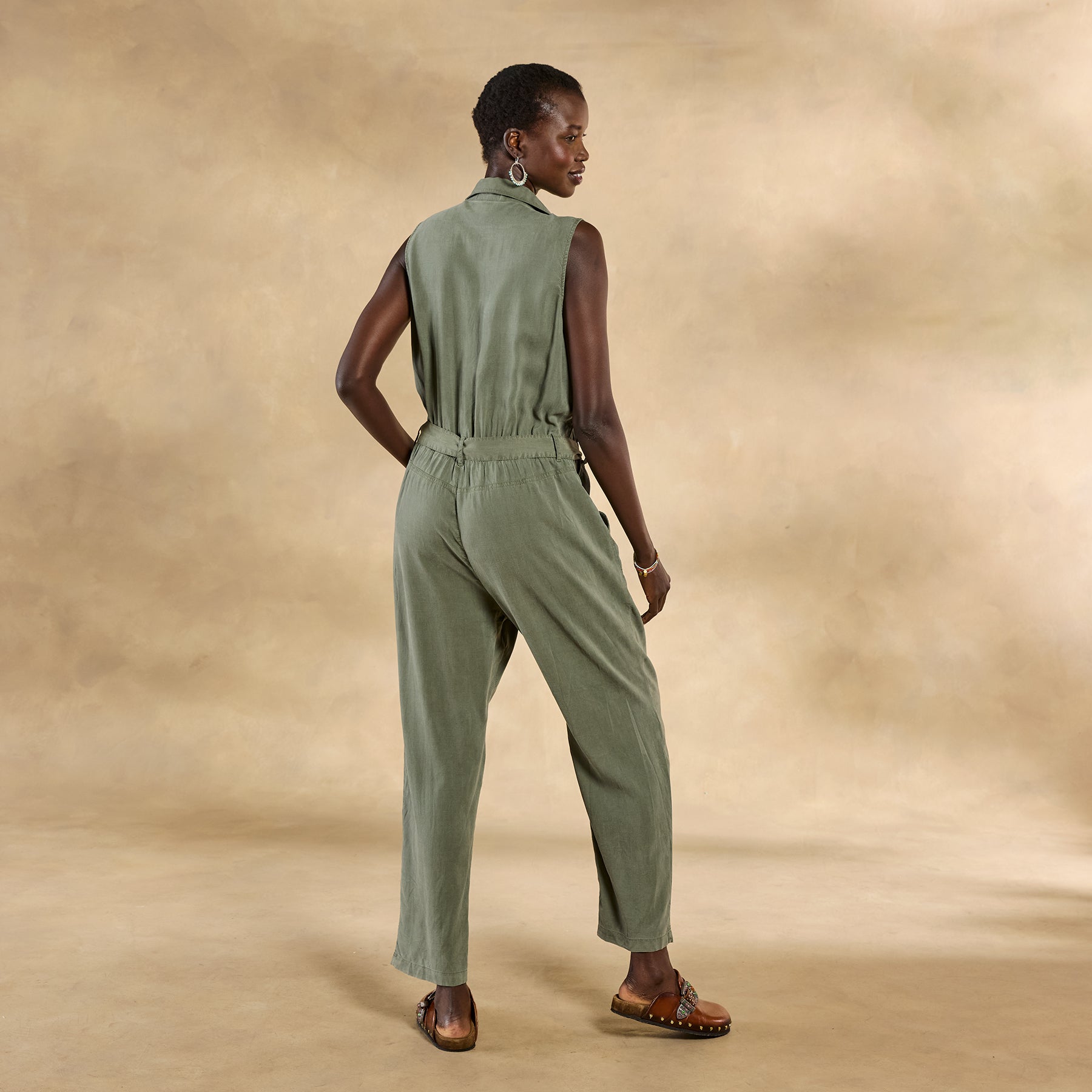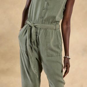 So soft. our draping jumpsuit features elastic waist. two front pockets. roll hem and button front. Self-tie belt. Tencel. Machine wash. Imported. Sizes XS (0 to 2). S (4 to 6). M (8 to 10). L (12 to 14). XL (16 to 18). 28-1/2 inseam.