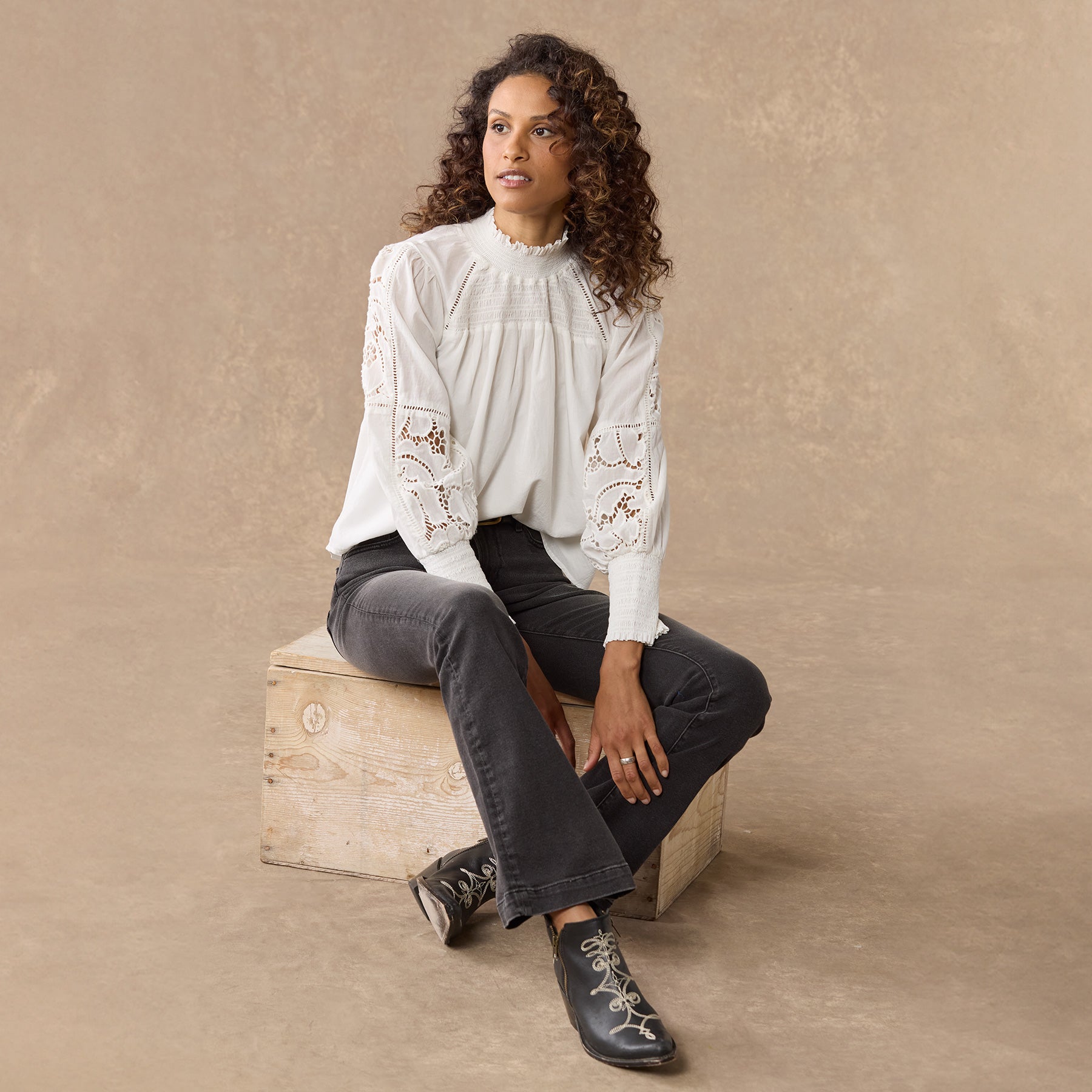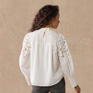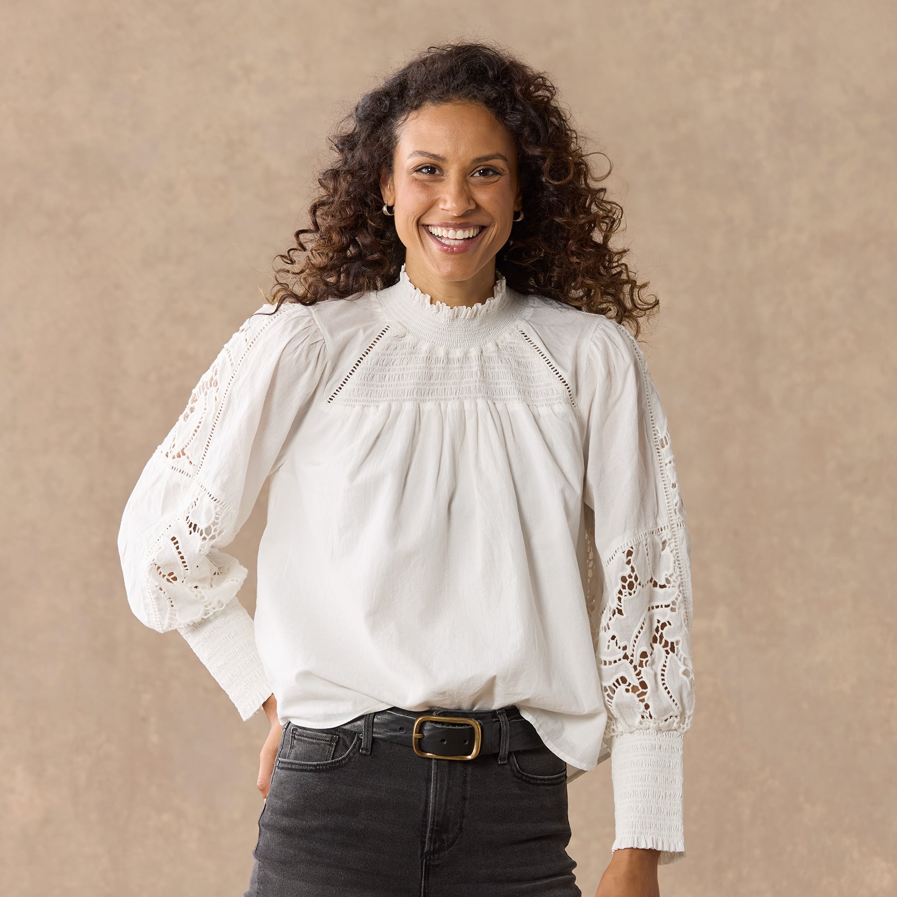 This ultra-feminine silhouette features smocking at the yoke and cuffs. ladder lace. lace insets and a ruffle at the neck. Cotton. Hand wash. Imported. Sizes XS (0?C2). S (4?C6). M (8?C10). L (12?C14). XL (16?C18). Approx. 23.25l.
