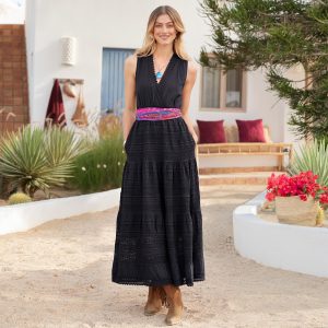 Our sleeveless maxi dress is adorned with beautiful crochet lace throughout. With pintucks on the skirt. a surplice neckline. a surplice back with ties. smocked waist and side seam pockets. Lined. Cotton. Machine wash. Imported. Exclusive. Sizes XXS (00). XS (0??). S (4??). M (8??0). L (12??4). XL (16??8). Approx. 50.75l.