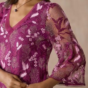 This stunning. above-the-knee shift dress is highlighted with rich colors. allover floral embroidery. bell sleeves. eyelash detail at the V-neckline. scalloped lace hem and a keyhole back. Polyester. Hand wash. Imported. Sizes XS (0 to 2). S (4 to 6). M (8 to 10). L (12 to 14). XL (16 to 18). XXL (20 to 22). Approx. 37-1/2L.