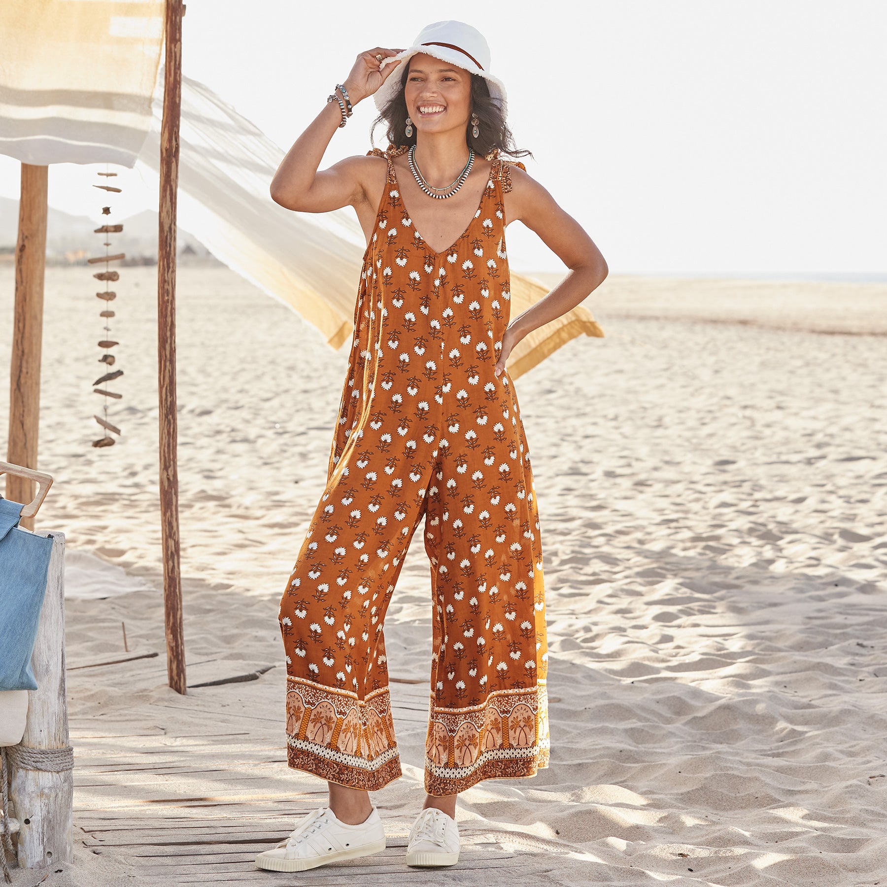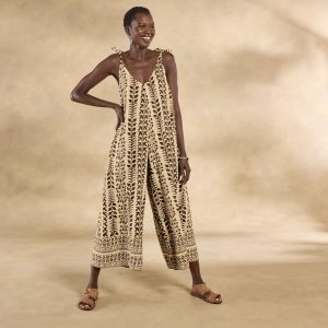 Our darling Temple Jumpsuit puts the romp in romper—with a striking graphic print elevating the most flattering. forgiving silhouette. V-neck bodice and cropped. wide leg. Modal. Machine wash. cold. with like colors; line dry in shade. Imported. Sundance exclusive. Sizes XS (0–2). S (4–6). M (8–10). L (12–14). XL (16–18). Approx. 26.5 inseam.