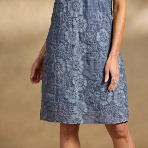 Easy and elegant. this flowing shift dress in vintage-inspired washed indigo is embellished with tonal floral embroidery. Fully lined. with keyhole button back. Ramie/Cotton. Hand wash. Imported. Sundance exclusive. Sizes XS (0–2). S (4–6). M (8–10). L (12–14). XL (16–18). XXL (20–22). Approx. 38.5l